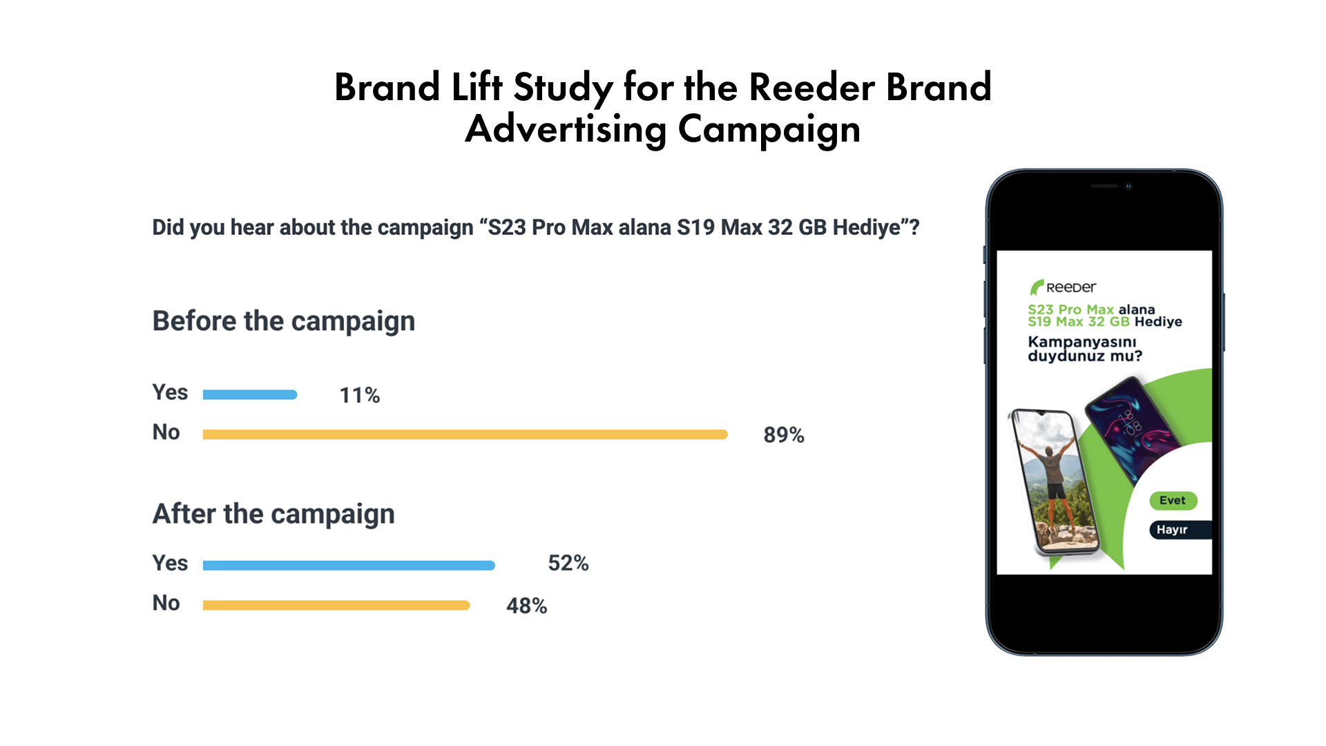 Second, Brand Lift research helps evaluate mobile campaign results. The survey is conducted in two stages. First, specialists determine brand awareness among the audience that did not see the ad banners. Then — among those who did. Device ID allows distinguishing between users.