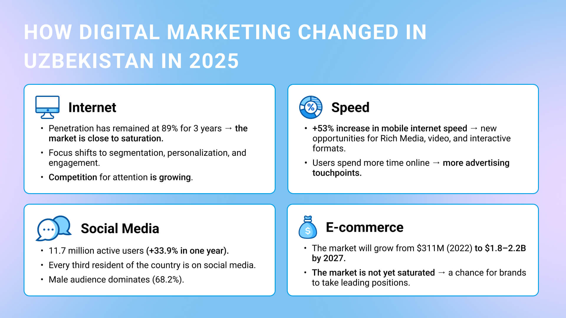 In 2025, digital marketing in Uzbekistan is changing. Internet penetration stabilized at 94,2%, indicating market saturation and intensifying competition for audience attention. At the same time, mobile internet speed increased by more than 50% and social media users exploded (+33.9% year-on-year), opening new opportunities for brands. The focus now shifts to a mobile-first strategy, personalization, and programmatic technologies, which allow precise targeting and high engagement.