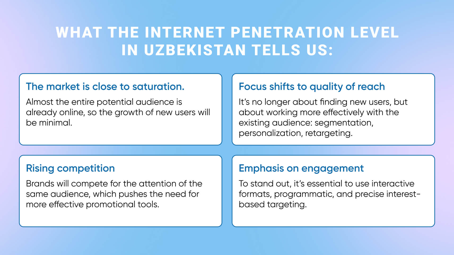 Based on this, advertisers should invest in deeper audience engagement. This is the foundation of modern digital marketing in Uzbekistan.