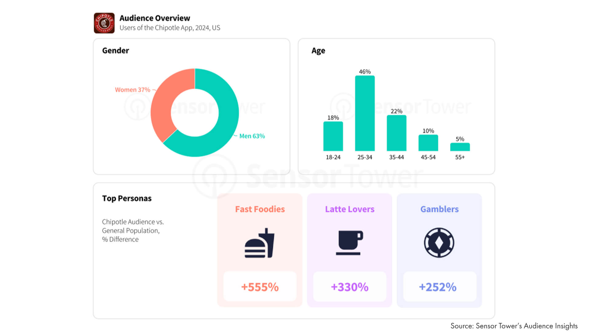 For example, an analysis of Chipotle app users showed that 63% of the audience was male, with the highest concentration in the 25-34 age group.