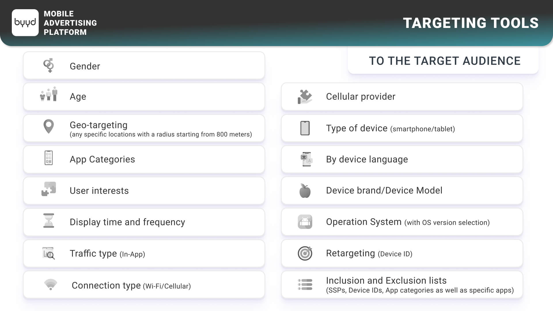 BYYD is a mobile DSP platform with more than 10 years of experience in in-app promotion. We help brands scale in local and international markets, providing precise targeting, transparent analytics, and innovative advertising solutions.