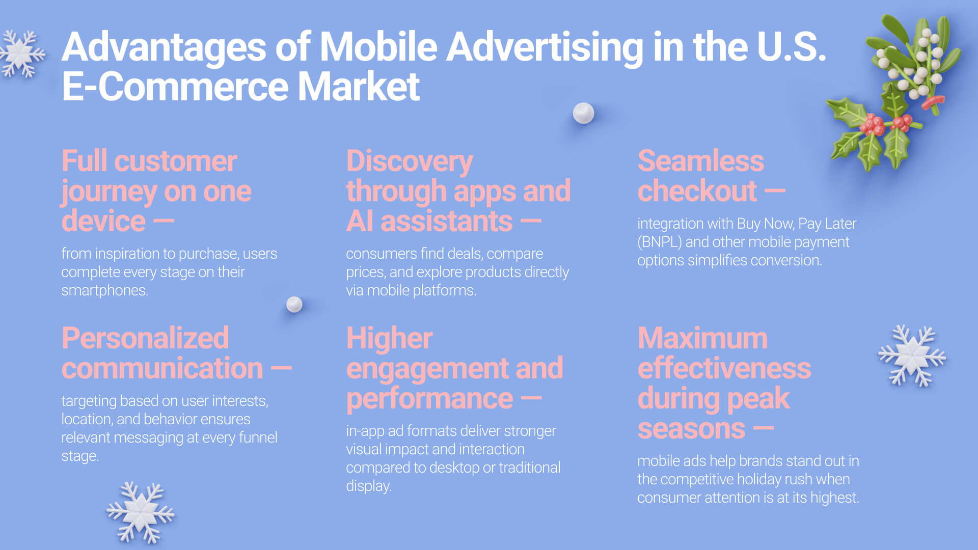 Unlike traditional display or desktop advertising, mobile in-app formats provide higher engagement, visual impact, and measurable performance, making them especially effective during the holiday shopping rush when competition for attention peaks.