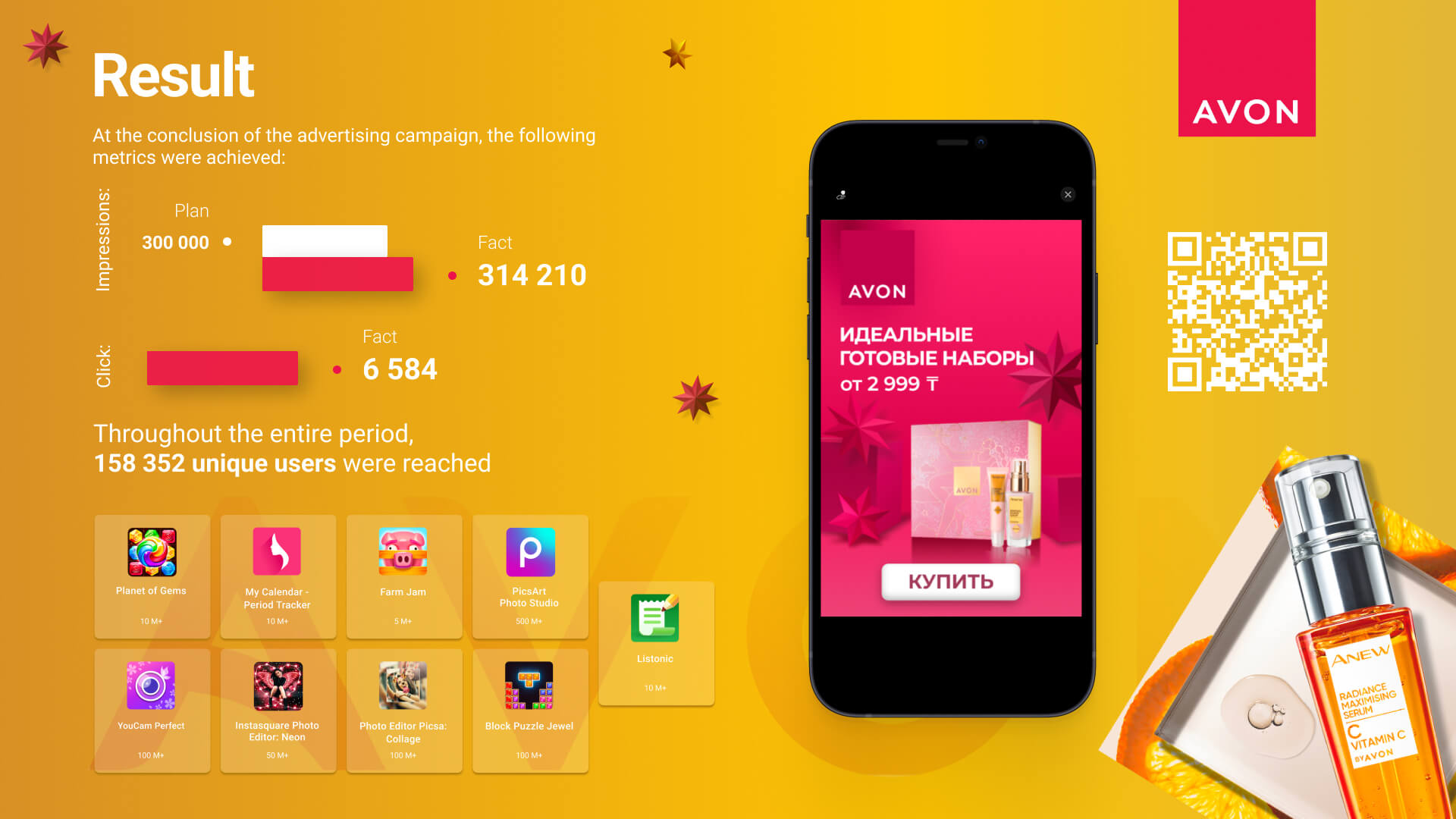 To promote AVON cosmetics during the New Year period, the BYYD team used an animated rich media banner. As a result, the campaign reached 158,000 unique users and achieved a CTR of 2.10%.