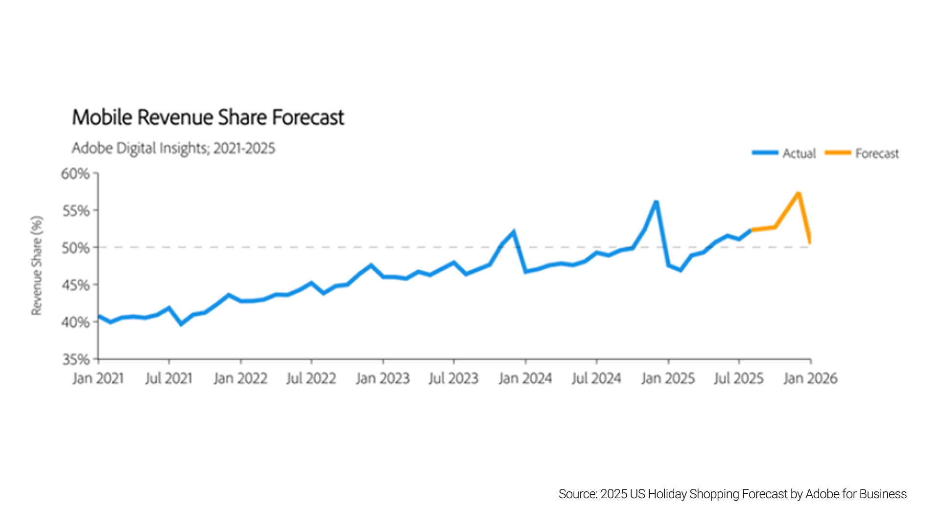 According to the latest Adobe for Business Holiday Forecast, mobile has become the centerpiece of shopping behavior, driving the majority of online transactions. Consumers are not just browsing but completing their entire purchase journey on smartphones — from discovering discounts to using Buy Now, Pay Later options at checkout.