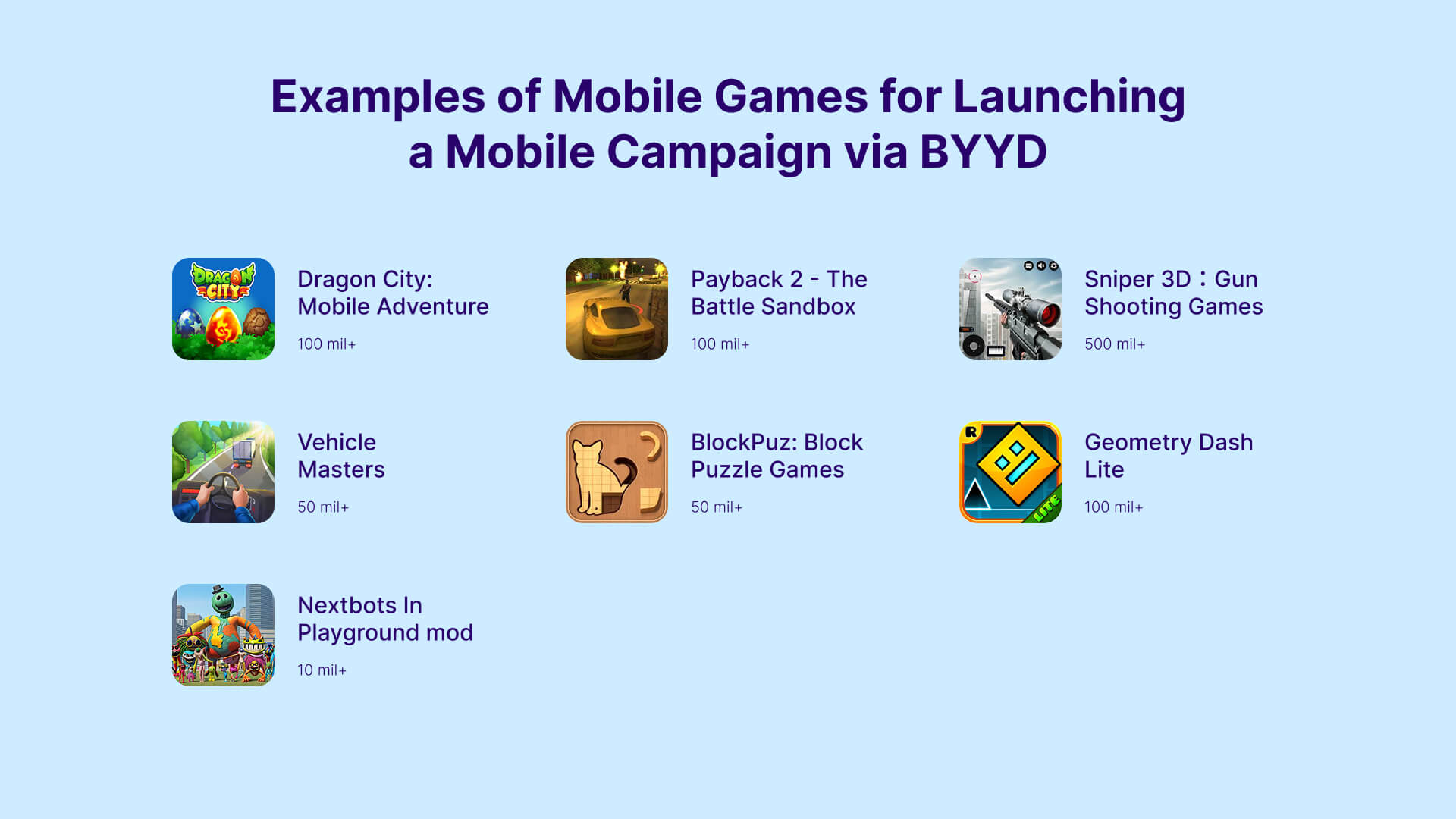BYYD mobile specialists choose applications for advertising based on the relevant interests of the target audience. When necessary, a White List is created, containing specific placements selected for promotion.