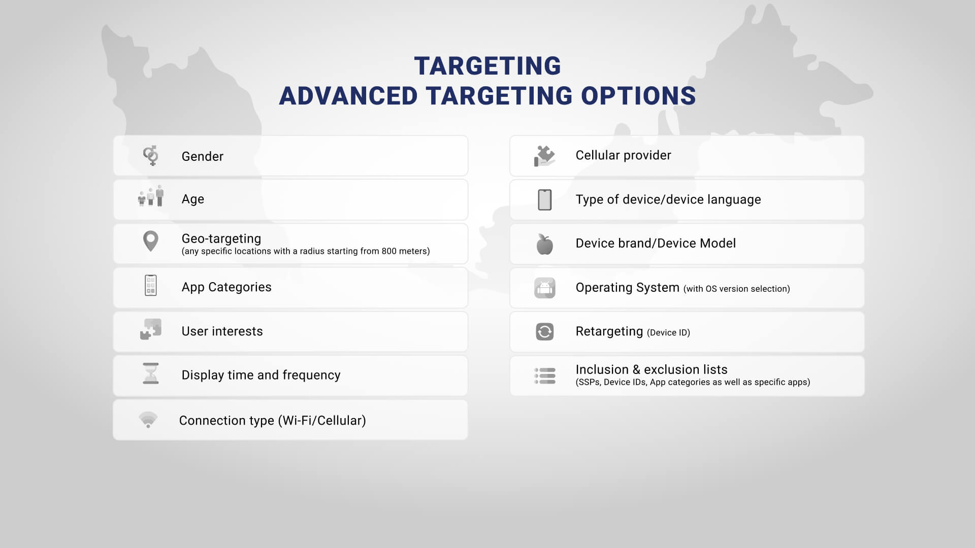 BYYD enables precise in-app targeting to reach the most relevant audiences. Campaigns can be tailored using socio-demographic data, geolocation, user behavior and interests, as well as device and OS parameters.