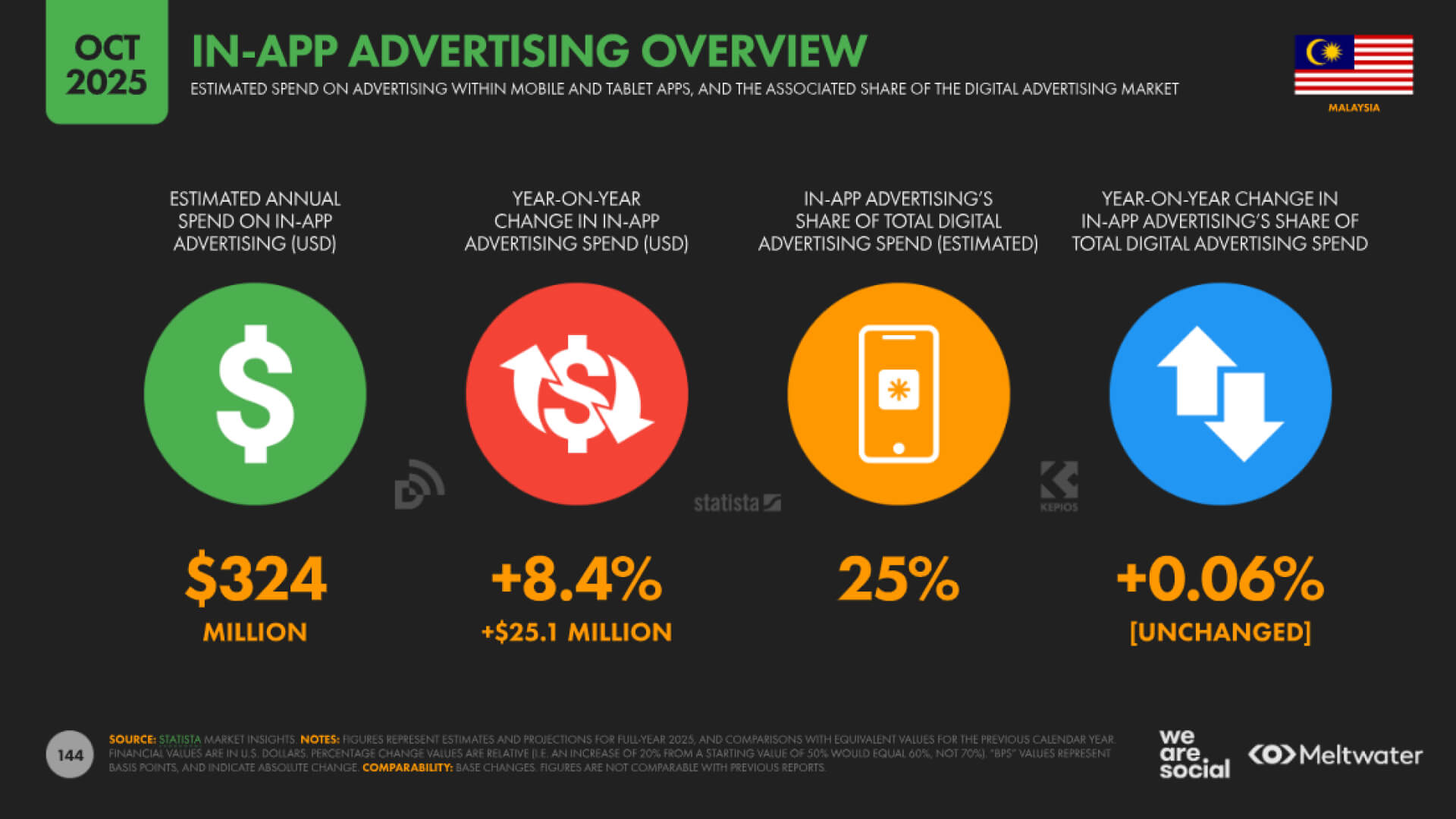 In-app advertising spend in Malaysia reached $324 million, showing 8.4% year-over-year growth. In-app formats account for 25% of total digital ad spend. The statistic highlights the strong and stable role of mobile apps as a key channel for audience engagement.