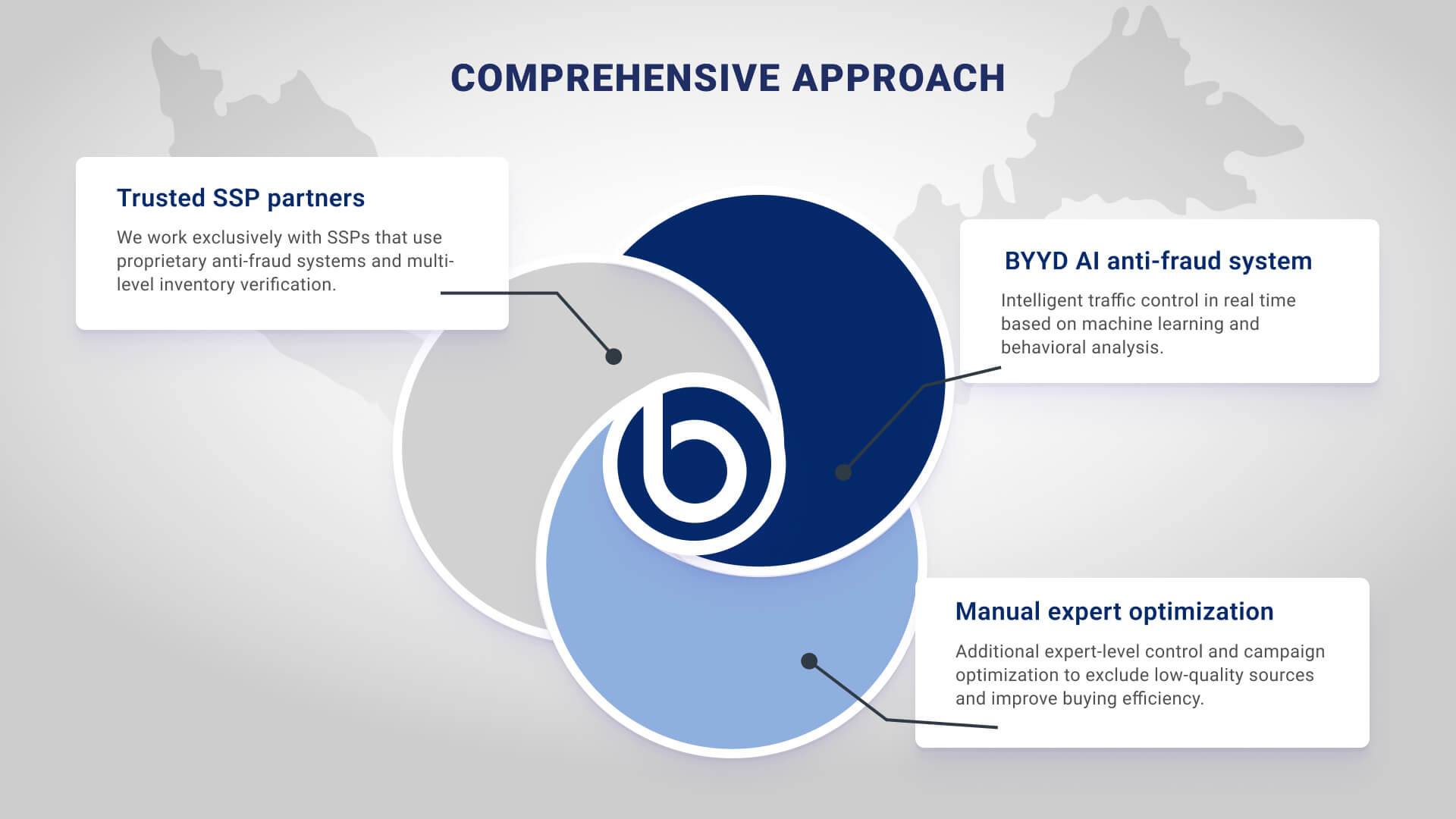 BYYD ensures safe and reliable ad placements through multi-level inventory verification, third-party traffic quality checks, dynamic inclusion and exclusion lists, and buying impressions only from verified devices.