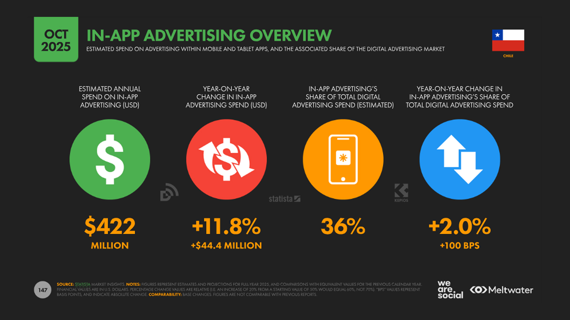 The in-app advertising in Chile is estimated at $422 million, which highlights the growing importance of mobile and tablet apps in the country’s digital media mix. With in-app accounting for 36% of total digital ad spend, app-based environments already represent a significant share of the market.
