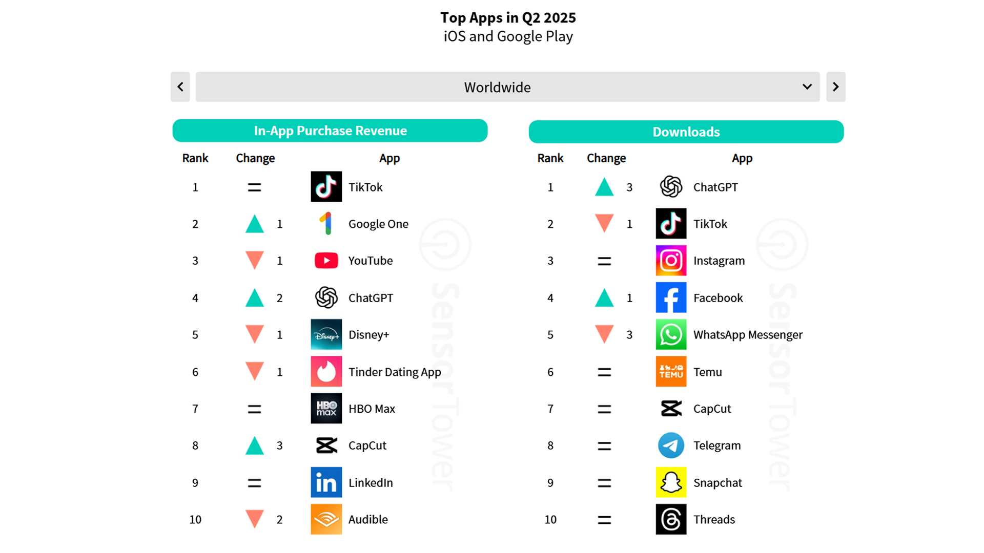 ChatGPT llegó a 1 mil millones de descargas en iOS y Google Play, ingresando al TOP-5 de aplicaciones no lúdicas por ingresos de compras integradas, superando a Disney+ y Tinder.
