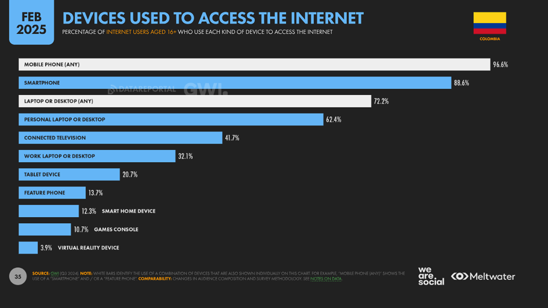 El 96,6 % de los usuarios en Colombia acceden a internet a través de teléfonos móviles, mientras que el 72,2 % también utiliza un escritorio o portátil.