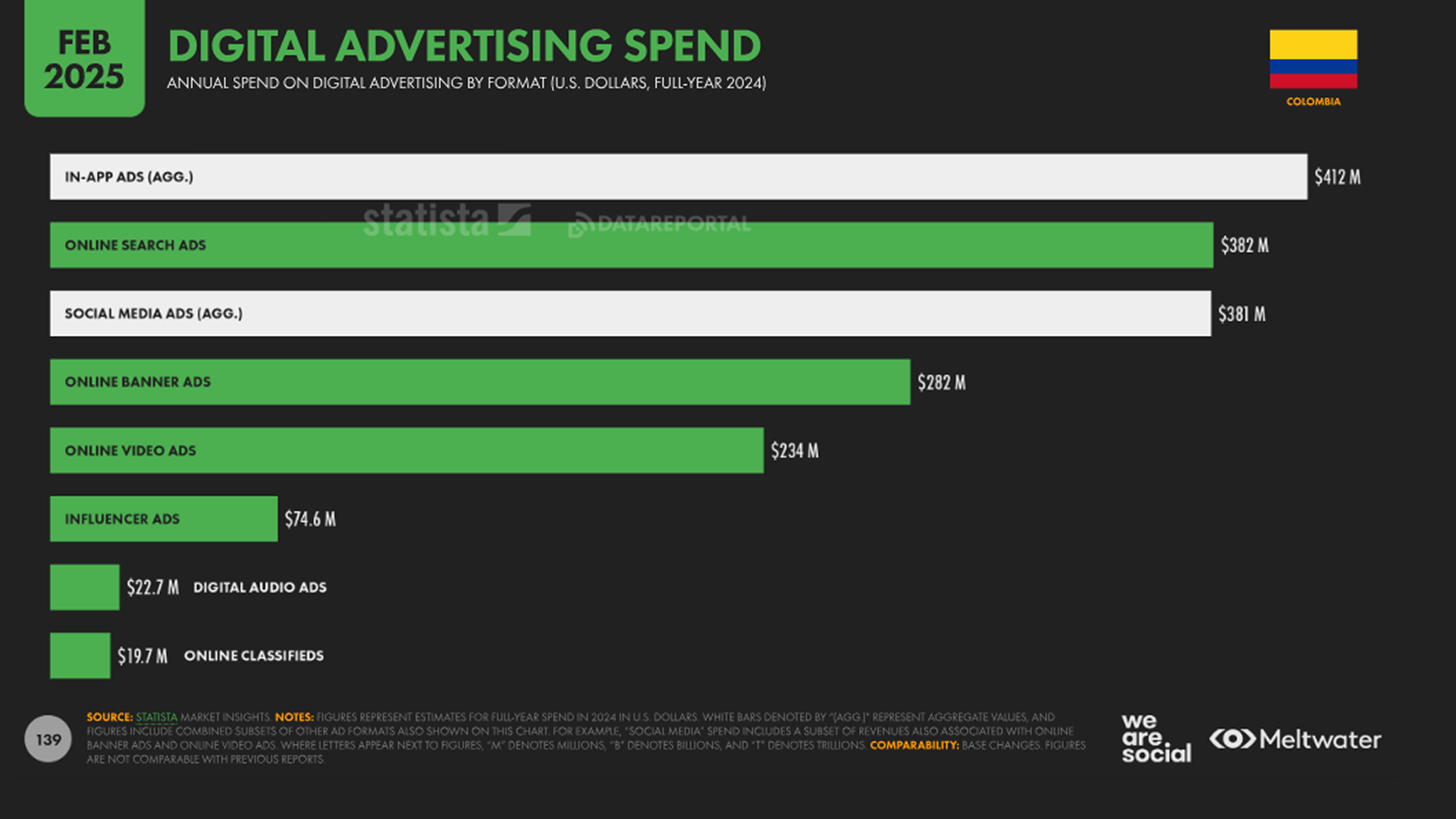 La publicidad en aplicaciones lidera, con el enfoque móvil de los colombianos impulsando inversiones sustanciales en ubicaciones de anuncios dentro de aplicaciones móviles.