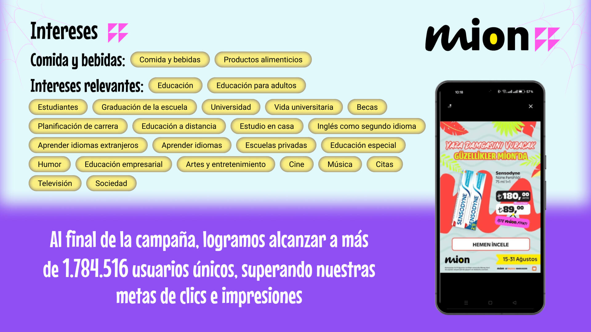 Con banners Rich Media, los especialistas promovieron cosméticos de la marca Mion, alcanzando 1,784,516 usuarios únicos, confirmando que la publicidad móvil es una herramienta eficaz para productos de belleza.