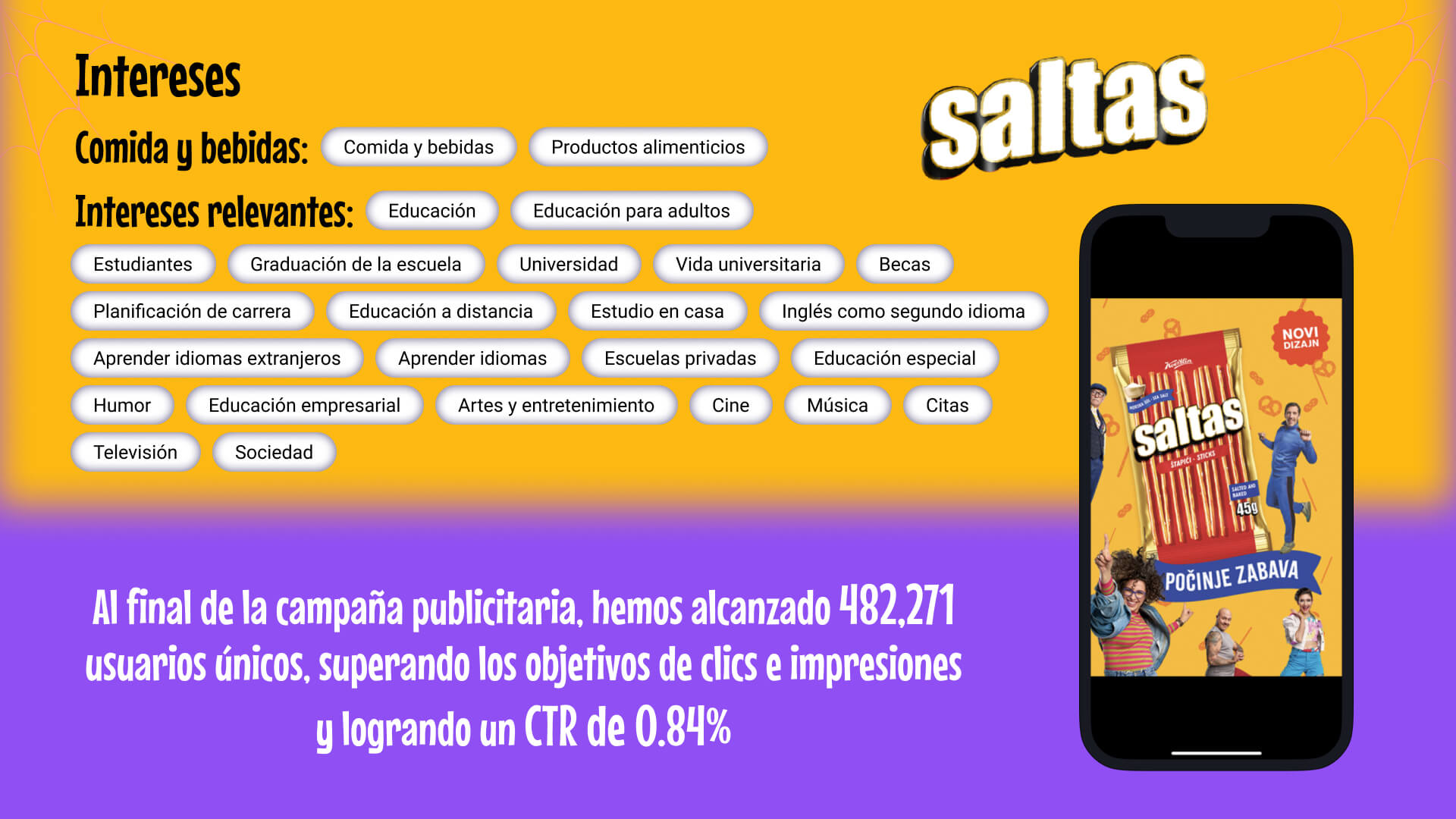 Para la promoción de palitos y pretzels Saltas, BYYD desarrolló un banner Rich Media animado con targeting para usuarios de 18-55 años interesados en comida, bebidas, música, cine y aprendizaje de idiomas, alcanzando 482,271 usuarios, demostrando la efectividad del in-app para el segmento FMCG.