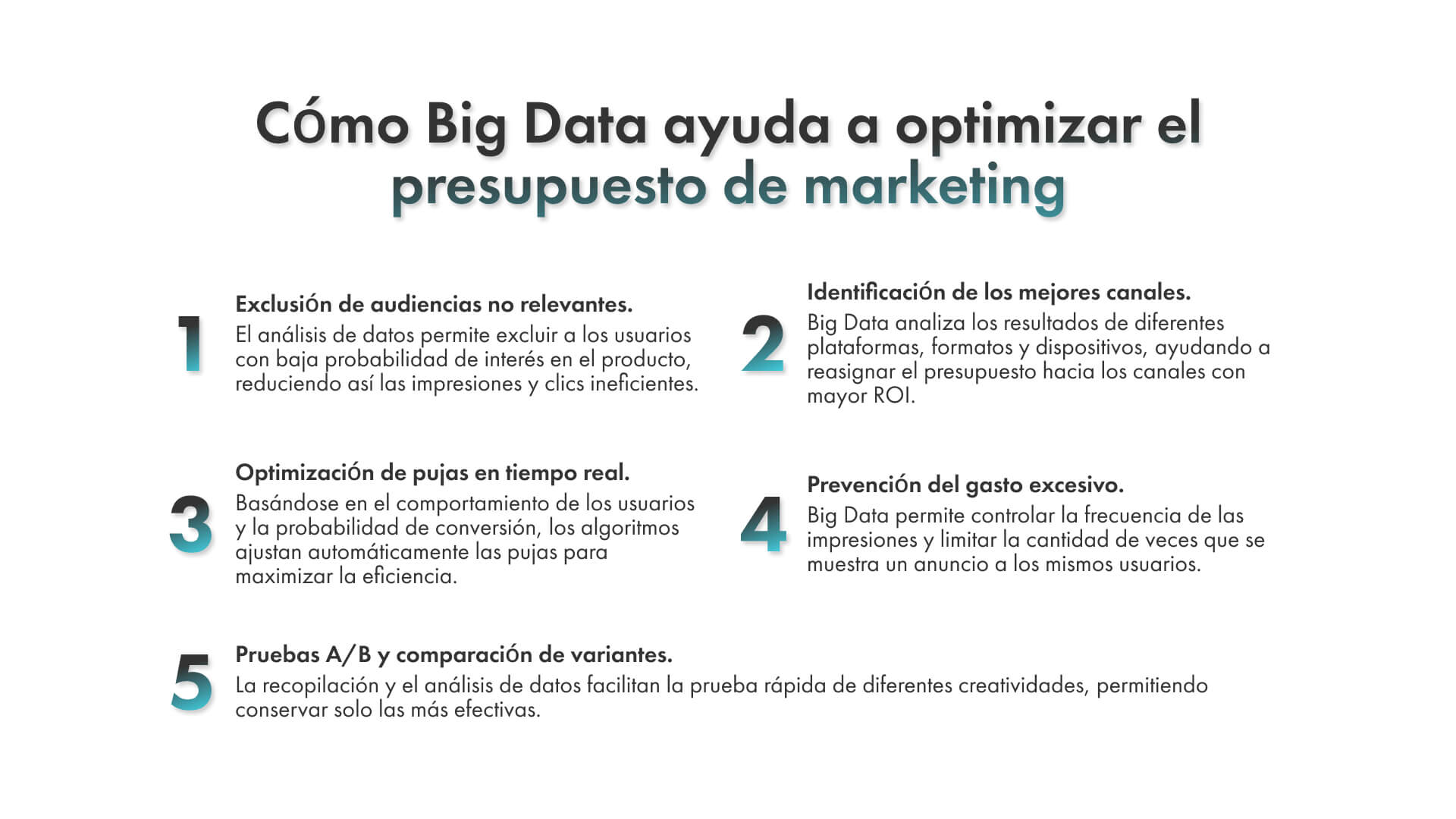 Con Big Data, se puede configurar la publicidad móvil para los segmentos que brindan el mayor retorno. Esto reduce los gastos innecesarios y mejora el ROI.