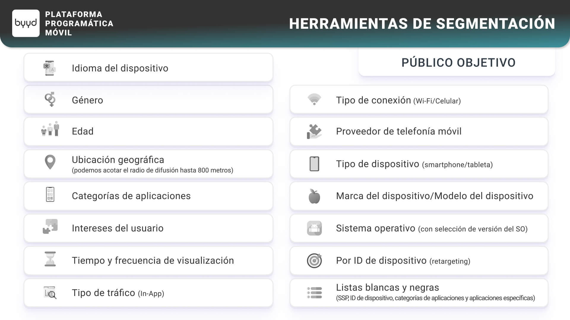 La plataforma móvil BYYD utiliza identificadores de dispositivos (IDFA/GAID) para formar segmentos de público y optimizar las campañas publicitarias.