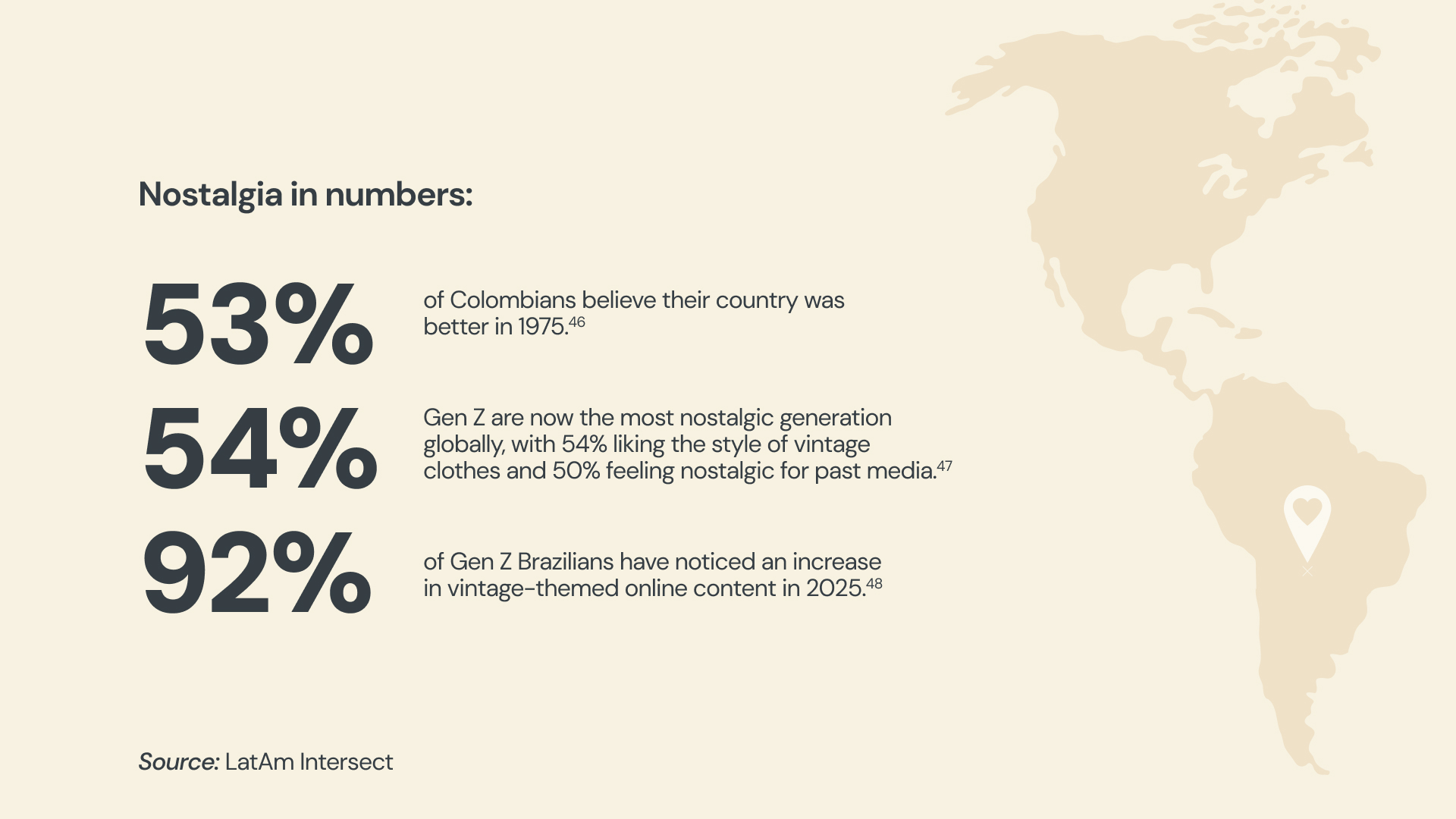 A pesar de que muchos países latinoamericanos atravesaron dictaduras en el siglo XX, los consumidores sienten una fuerte nostalgia por el pasado, especialmente por la sensación de felicidad y seguridad. En la Generación Z esto es una reacción a la inestabilidad del mundo actual.