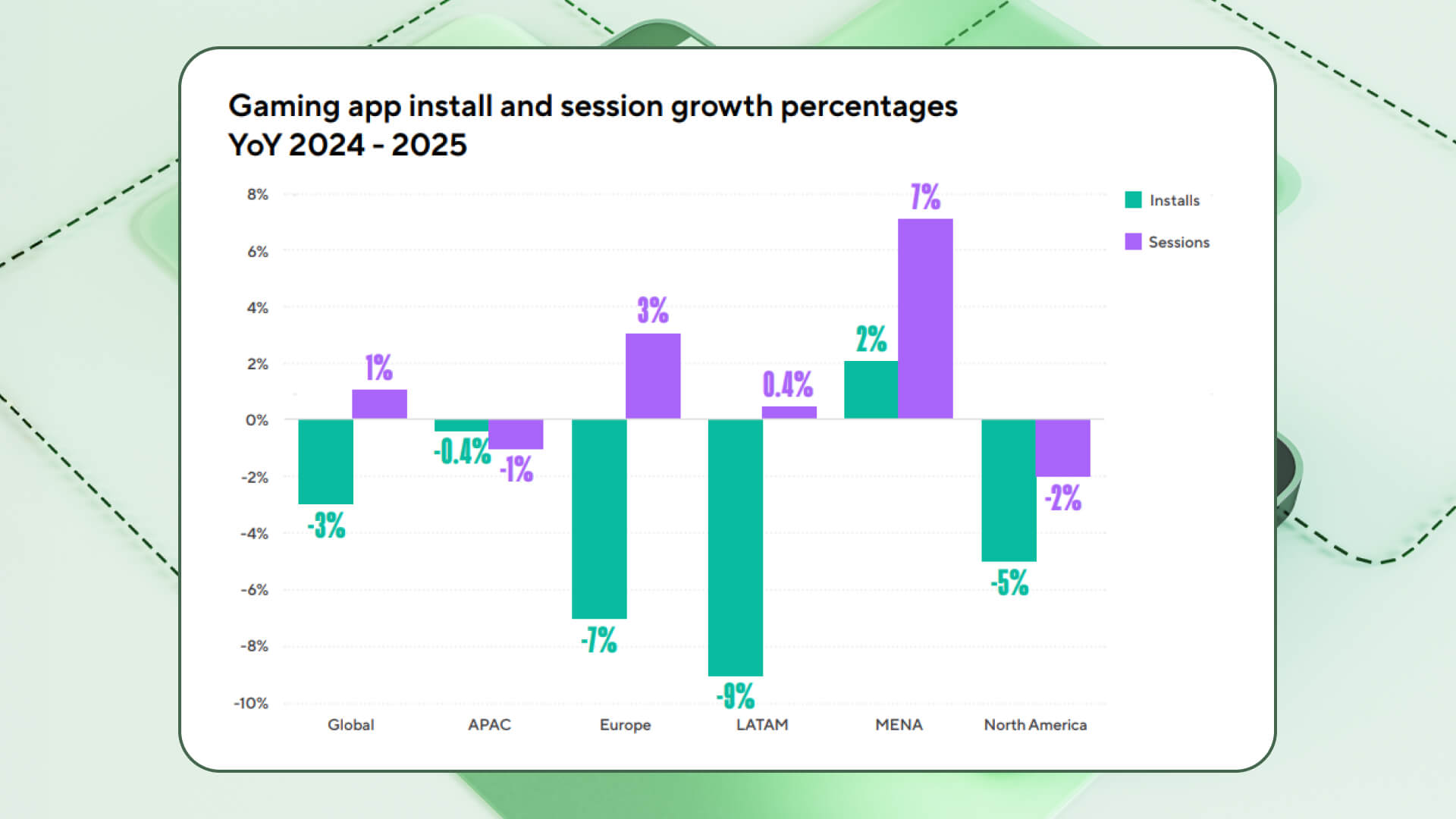 En primer lugar, en 2025 las instalaciones de aplicaciones de juegos en LATAM disminuyeron un 9 %. Sin embargo, el número de sesiones se mantuvo prácticamente estable (0,4 %). Esto indica que no hay una fuga significativa de usuarios: la audiencia activa se mantiene y los jugadores siguen regresando.