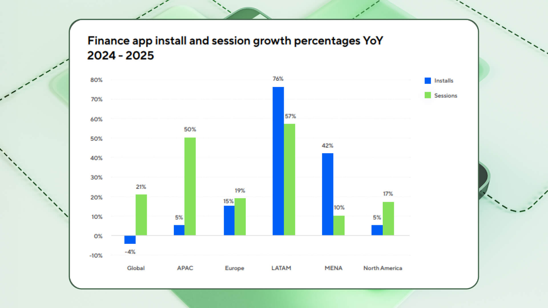 En LATAM, las instalaciones de aplicaciones financieras crecieron un 76 % interanual, mientras que las sesiones aumentaron un 57 %.