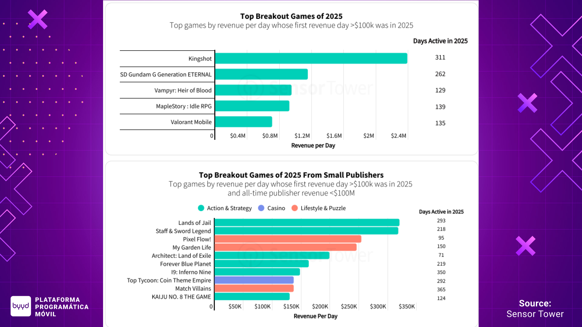 También destacaron Vampyr: Heir of Blood y MapleStory: Idle RPG, con fuerte crecimiento en Corea del Sur, así como Valorant Mobile, lanzado en China y que rápidamente entró en el top 6 de shooters por ingresos.