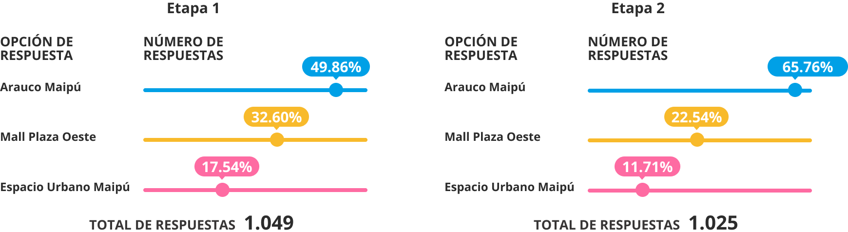 El BLS se realizó en dos etapas con usuarios de la audiencia objetivo. En la primera etapa, la encuesta se mostró a toda la audiencia para medir el nivel base de preferencia y percepción de los centros comerciales. En la segunda etapa, las mismas preguntas se dirigieron únicamente a los usuarios cuyo Device ID fue registrado tras hacer clic en el video de branding de Arauco Maipú, lo que permitió evaluar de forma directa el impacto de la campaña publicitaria.