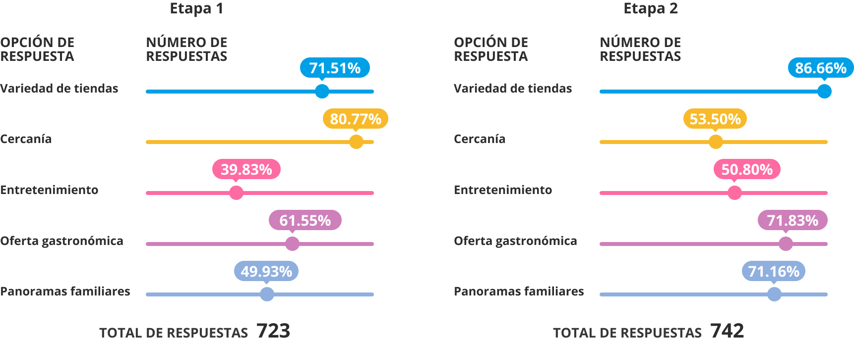 Según los resultados del estudio, la proporción de usuarios que eligen Arauco Maipú como su centro comercial preferido aumentó aproximadamente del 50% al 66% entre la audiencia que interactuó con la publicidad. Además, se observó un cambio en los principales drivers de elección: mientras que antes de la campaña la cercanía era el factor dominante, después del contacto publicitario ganaron relevancia la variedad de tiendas, la oferta gastronómica y los panoramas familiares. La proporción total de evaluaciones positivas (“Excelente” y “Buena”) también creció del ~60% al 72%, lo que confirma un aumento en la atracción y la lealtad hacia la marca.