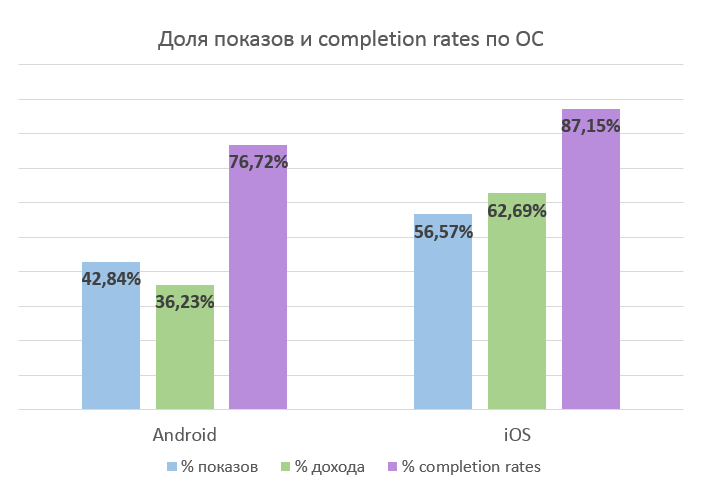 Если заглянуть в данные об Операционных Системах, мы увидим, что количество показов (57%) и процент просмотра видео до конца — completion rate (87%) на iOS в обоих случаях как минимум на 10% выше, чем на Android.