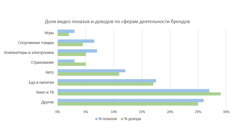 Компании из сферы развлечений генерируют больше видео показов и тратят больше выручки на видео форматы