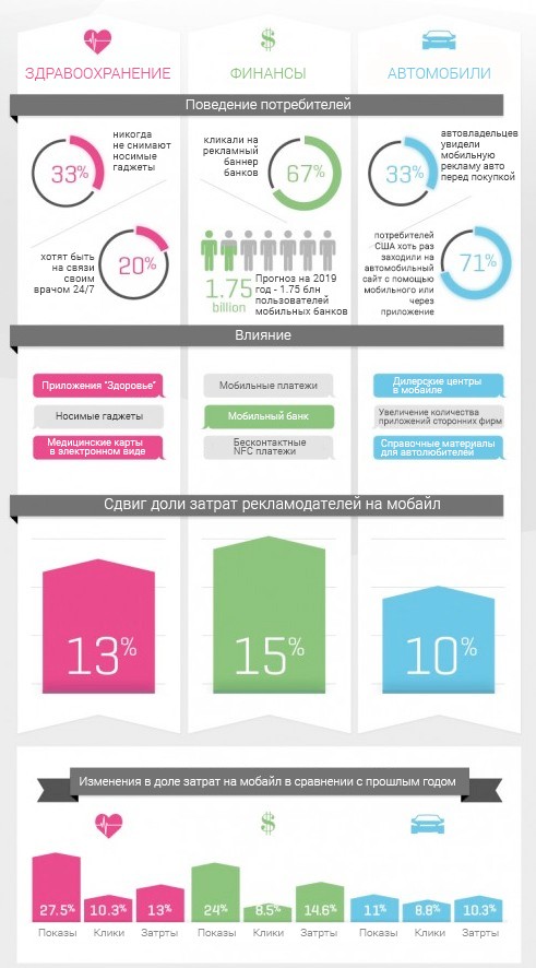Согласно новому исследованию от Marin Software, рекламного провайдера на разных медиа каналах, три индустрии, которые существенно увеличили затраты на мобильную рекламу в 1 квартале 2015 года – это Автомобильная, Финансовая сферы и Здравоохранение.