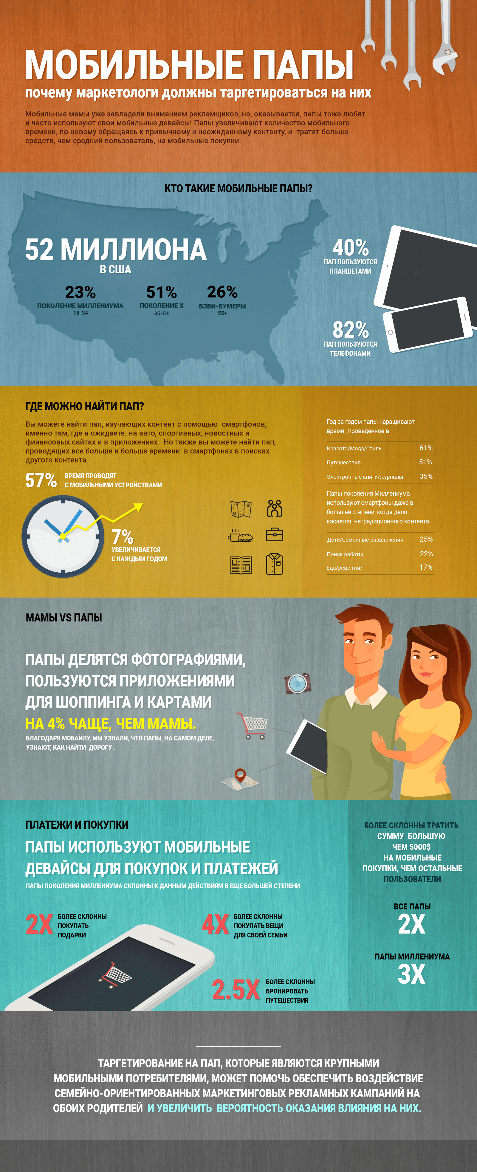 Мобильные мамы уже завладели вниманием рекламщиков, но, оказывается, папы тоже любят и часто используют свои мобильные девайсы! Папы увеличивают количество мобильного времени, по-новому обращаясь к привычному и неожиданному контенту, и тратят больше средств, чем средний пользователь, на мобильные покупки.