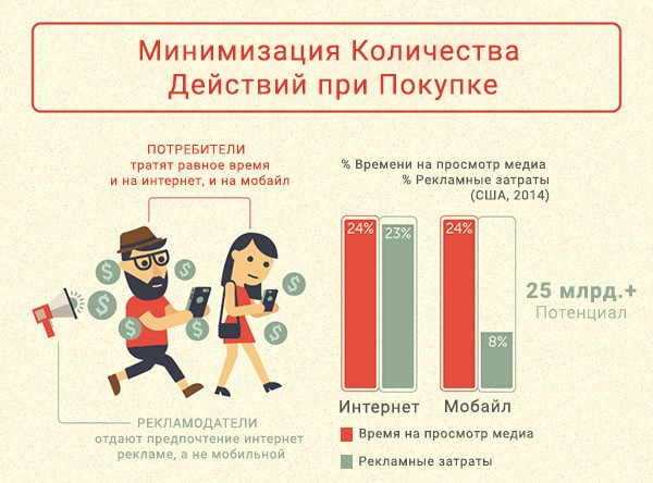 24% приходится на просмотр медиа на мобильных устройствах, но только 8% от рекламного доллара уходит в мобайл. Относительно мало, если сравнивать с интернетом.
