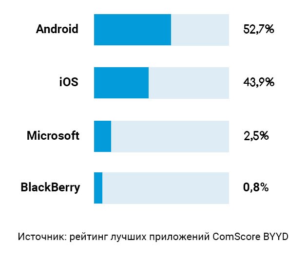 В рейтинг лучших приложений ComScore также включена разбивка мобильных операционных систем по каналам. Она показывает, что Android от Google продолжает доминировать, охватывая 52,7% рынка. IOS от Apple является другим доминирующим игроком – 43,9%. Microsoft (2,5%) и BlackBerry (0,8%) на данный момент занимают достаточно скромные позиции — 2,5% и 0,8% соответственно.