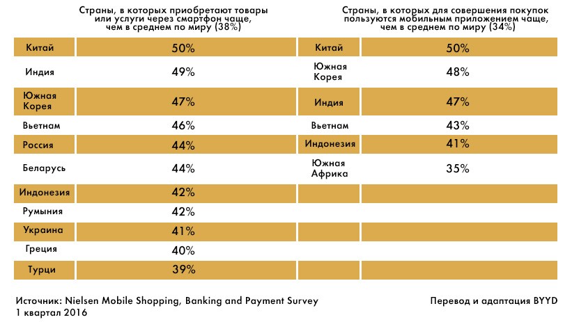 В первую очередь, в работе отмечается, что с мая по октябрь 2016 года 44% российских онлайн-покупателей минимум один раз использовали мобильные девайсы, чтобы приобрести товары или услуги. Средний мировой показатель — 38%.