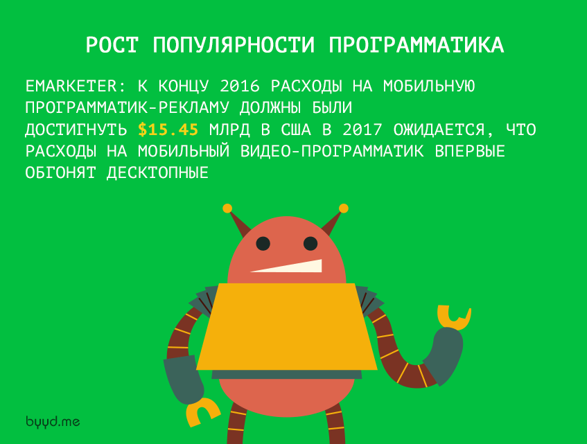 eMarketer предсказывал, что к концу 2016 расходы на мобильную программатик-рекламу достигнут $15.45 млрд в США. А в наступившем году ожидается, что расходы на мобильный видео-программатик впервые обгонят десктопные.