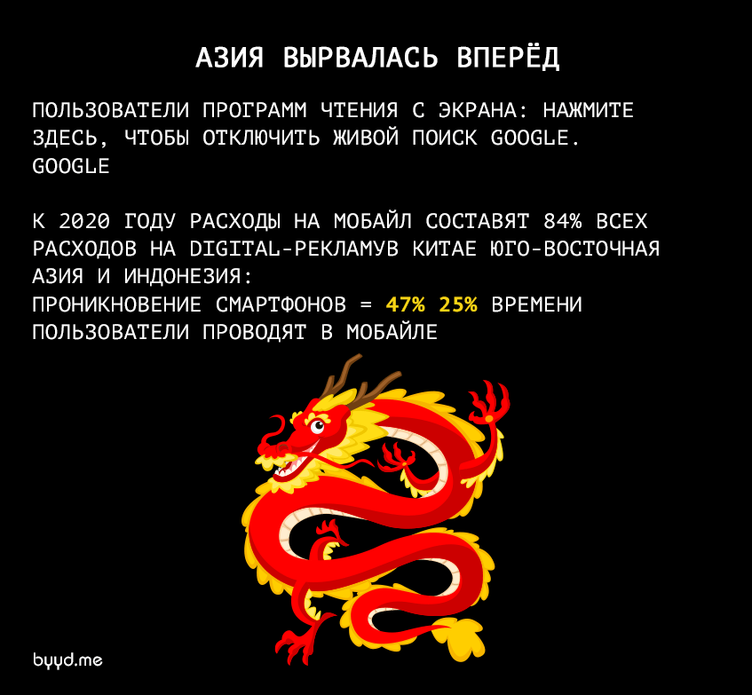 В то время как в США — самый большой рынок мобильной связи, наблюдается и значительный рост мобайла в Азии, что стало неожиданностью для многих американских брендов и рекламодателей. К 2020 году расходы на мобайл составят 84% всех расходов на digital-рекламу в Китае, предоставляя маркетологам огромные возможности.