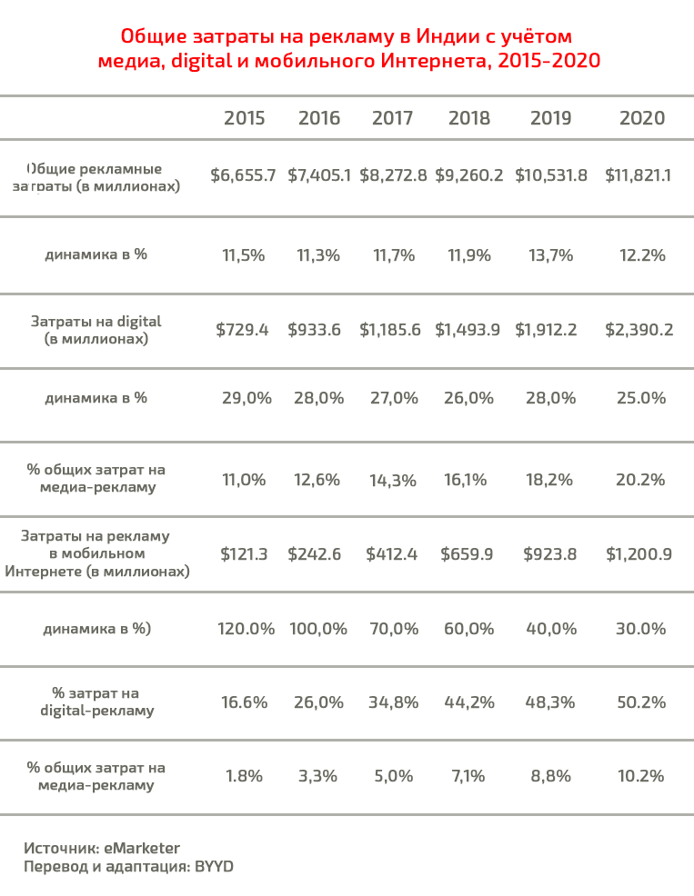 Цифровая реклама в Индии стремительно растёт — к 2020 году мобайл будет составлять 10,2% от общих медиа-расходов.