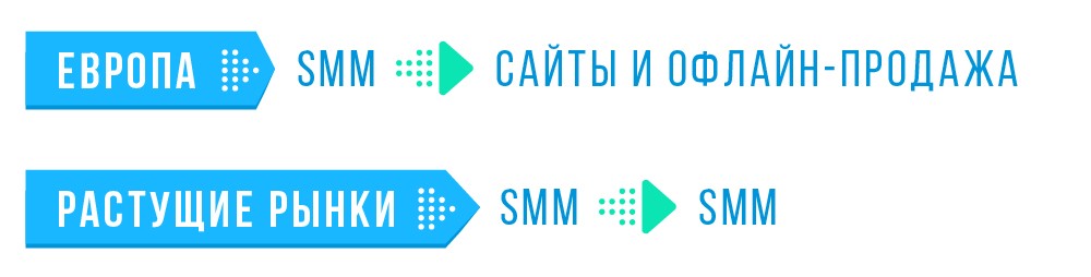 Существуют разные пути совершения покупки. К примеру, в Европе многие приходят совершать покупки на сайты компаний или в офлайн-точки продаж из социальных сетей. На растущих рынках пользователи взаимодействуют с брендами на всех этапах – от принятия решения до совершения покупки исключительно через социальные медиа.