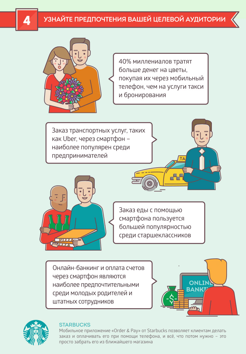 Помните об интересах потенциальных клиентов. Школьники больше всего покупают еду через смартфоны. Это значит, что рекламу таких товаров нужно создавать с упором на молодёжь. Такси комфорт-класса часто пользуются деловые люди, которые дорожат каждой минутой и трепетно относятся к своему социальному статусу. Их больше привлечет официальный стиль общения. Во всемирно известной сети кофеен Starbucks с помощью мобильного приложения можно заказать и оплатить кофе заранее, а затем просто забрать его без очереди. Это не только делает сервис комфортнее для потребителей, но и увеличивает лояльность клиентов к компании.