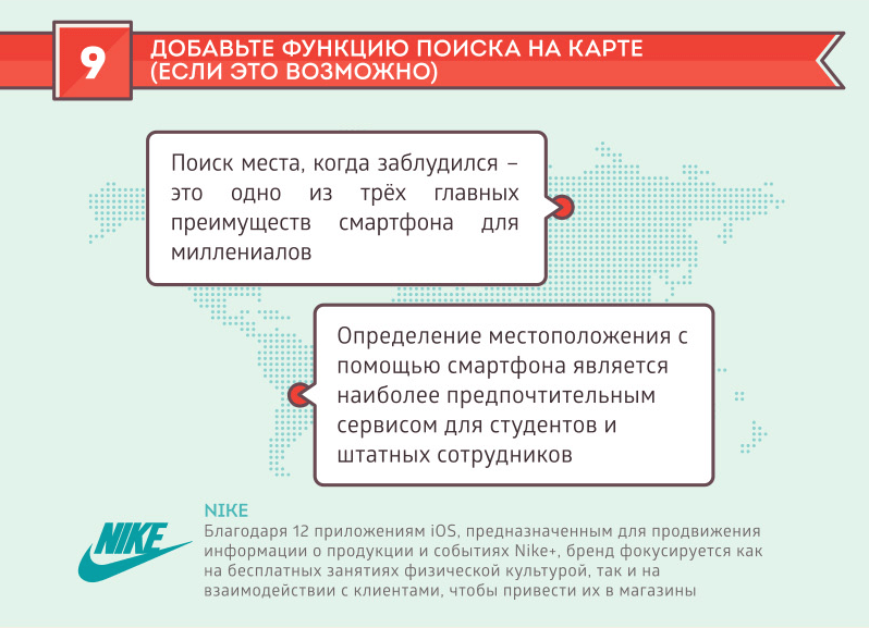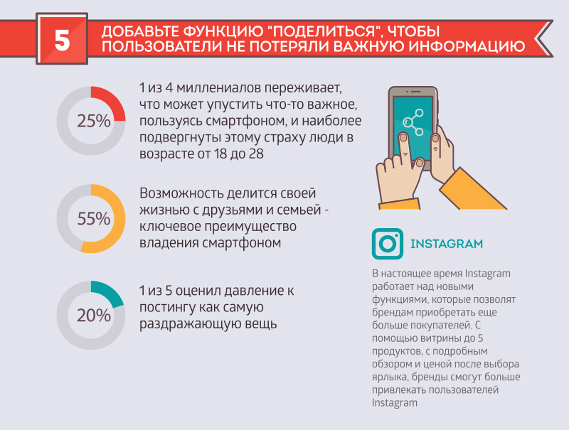 Добавьте в приложение функцию «Поделиться». На первый взгляд, это мелочь, но для молодежи возможность рассказывать о новостях, товарах или услугах крайне важна. 55% называют это главной функцией смартфона, а четверть старается всегда держать гаджет под рукой, чтобы не упустить ценную информацию.