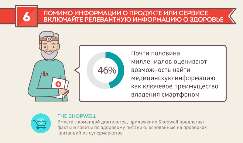 Рассказывайте клиентам о здоровье, давайте полезные советы в приложении — миллениалы оценят заботу. Например, компания Shopwell, которая продает экологические товары, работает совместно с диетологами и дает советы на основании чеков из супермаркетов. Такой индивидуальный подход не может не радовать.