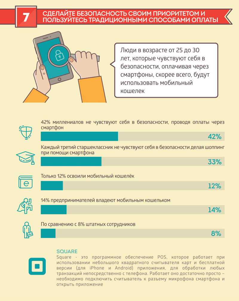 Сделайте оплату со смартфона безопасной. Молодые люди до 30 лет готовы оплачивать покупки через смартфоны и мобильные кошельки, но только если будут уверены в безопасности. Компания Square, к примеру, предлагает клиентам устанавливать небольшой съемный считыватель для подтверждения данных о транзакциях.
