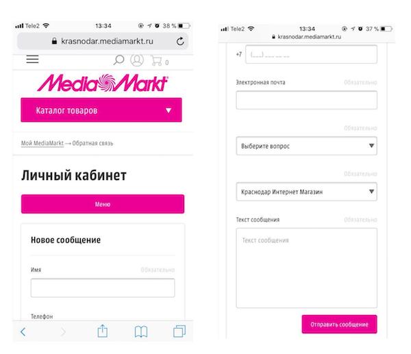 Есть и третий вариант — простая контактная форма. Пример раздела обратной связи мобильной версии сайта MediaMarkt: