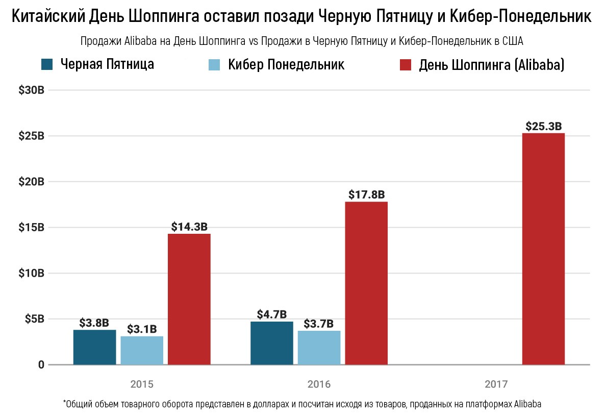 Alibaba — оптовый ритейлер в Китае, он является поставщиком товаров даже на AliExpress, знакомый практически каждому россиянину. 11 ноября 2017 года Alibaba получили рекордный объем продаж, равный $25 миллиардам. Это на целых 74% больше прошлого года.