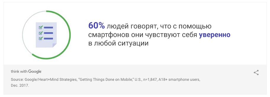 Смартфоны помогают не только делать что-либо. Они дарят уверенность, чувство выполненного долга: 60% людей говорят, что с помощью смартфонов они чувствуют себя более уверенными.