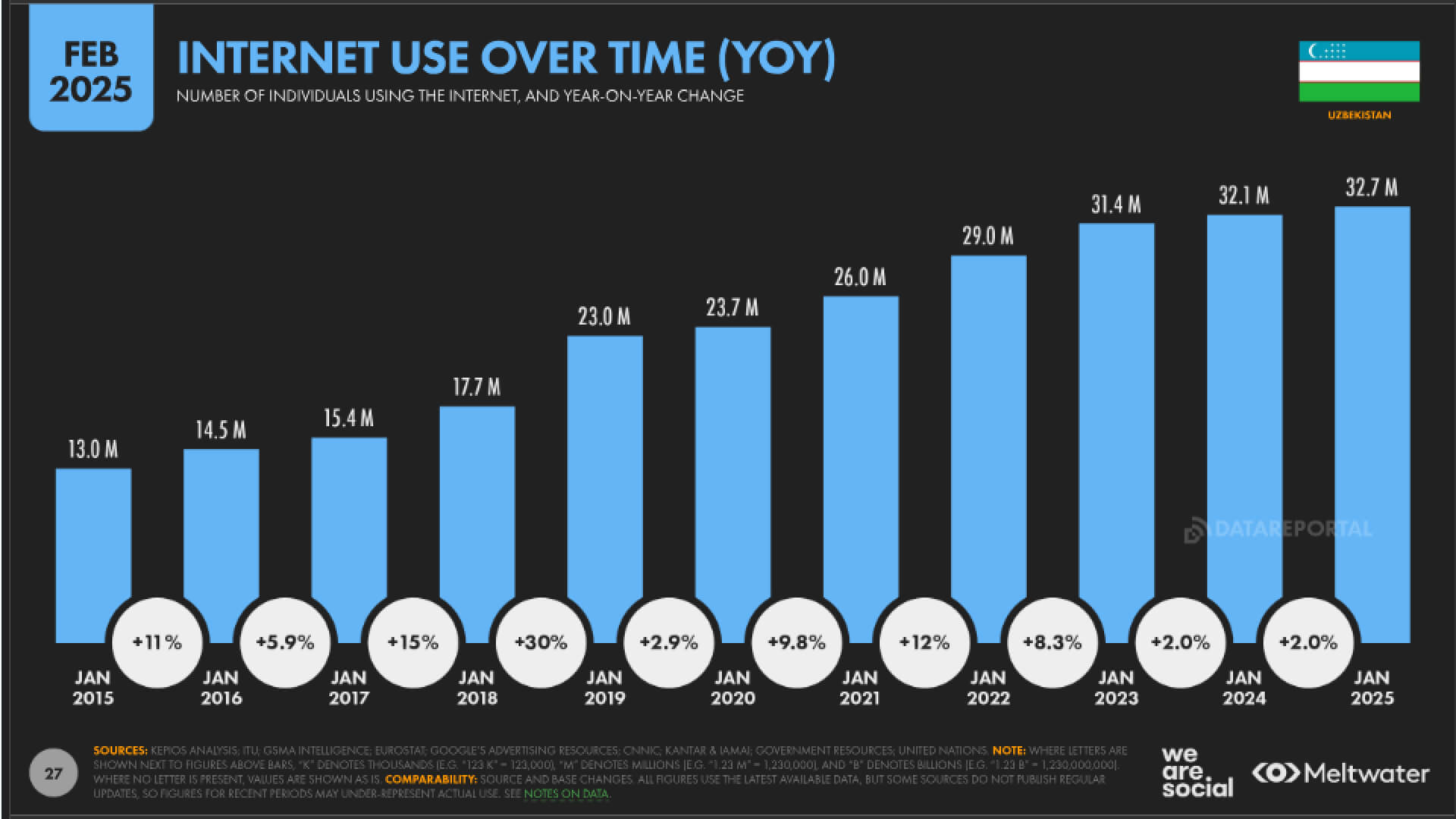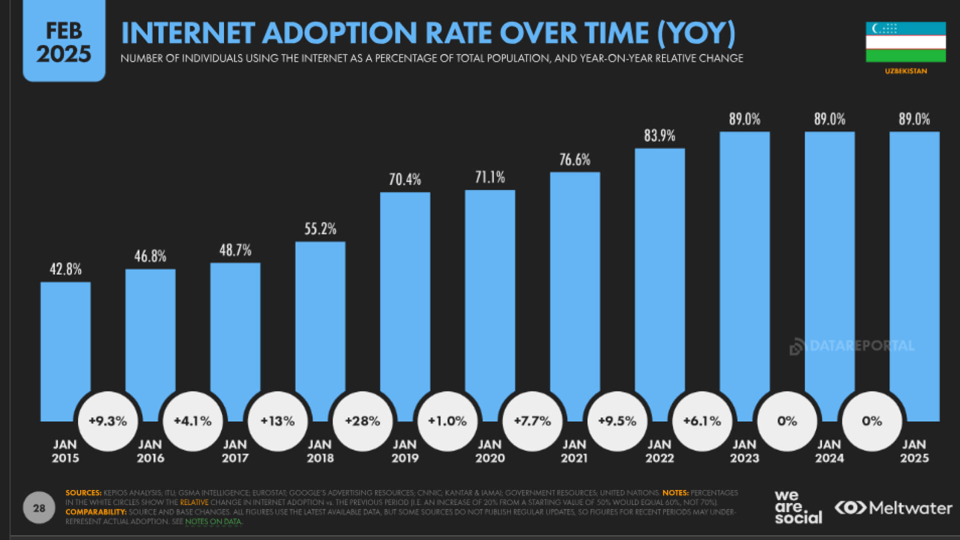 Анализ Kepios показывает, что число пользователей интернета в Узбекистане увеличилось на 626 тысяч с 2024 по 2025 год. При этом важно понимать, что процент от общей численности населения, который пользуется Интернетом, остался неизменным с 2023 года – 89%.