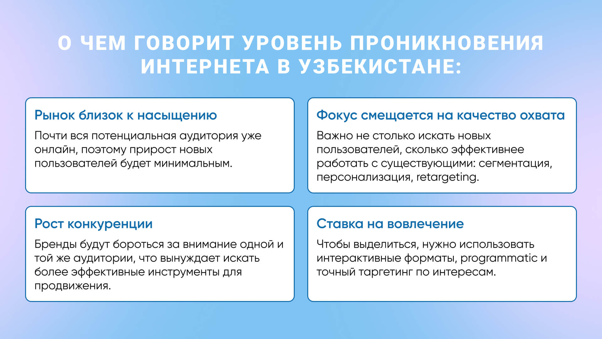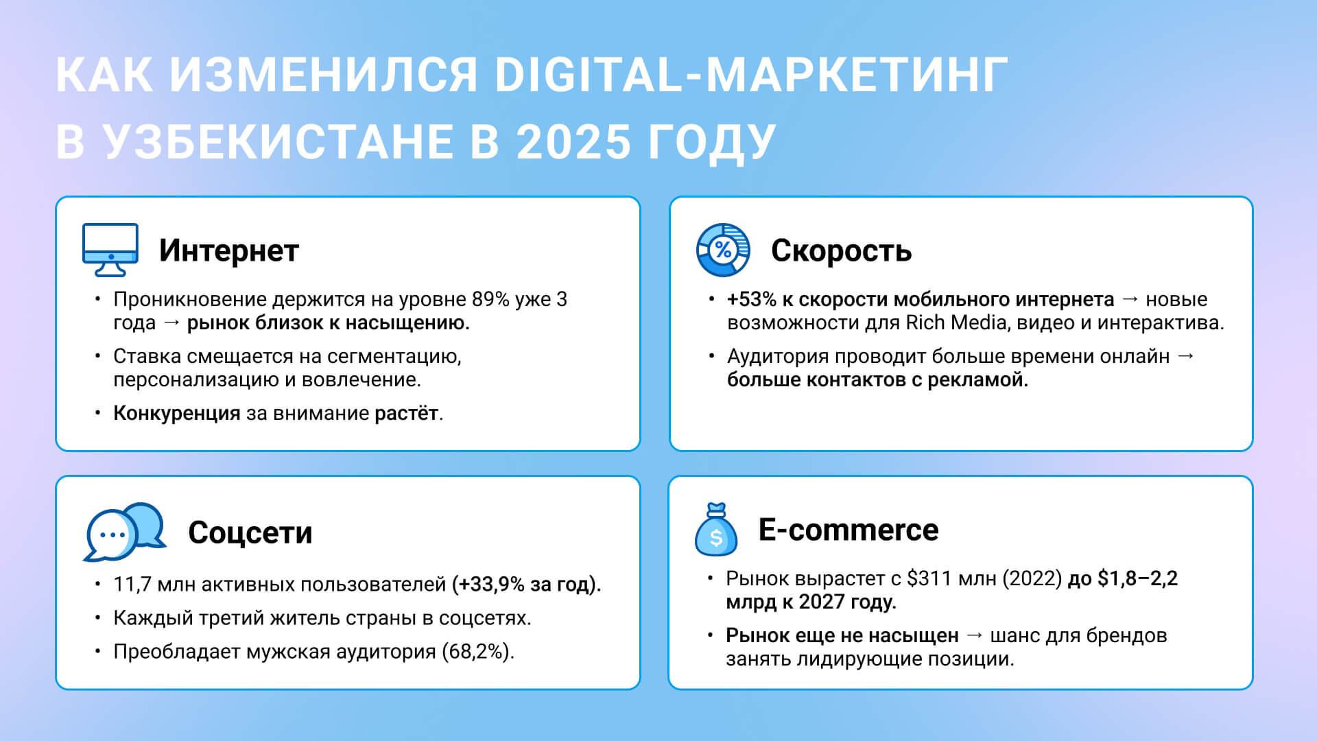В 2025 году диджитал-маркетинг в Узбекистане претерпевает изменения. Уровень проникновения интернета стабилизировался на отметке 94,2%, что указывает на насыщение рынка и усиливает конкуренцию за внимание аудитории. При этом рост скорости мобильного интернета более чем на 50% и взрывное увеличение числа пользователей соцсетей (+33,9% за год) открывают новые возможности для брендов. Сегодня фокус смещается на mobile-first стратегию, персонализацию и использование программатик-технологий, которые позволяют точнее работать с целевой аудиторией и добиваться высокой вовлеченности.