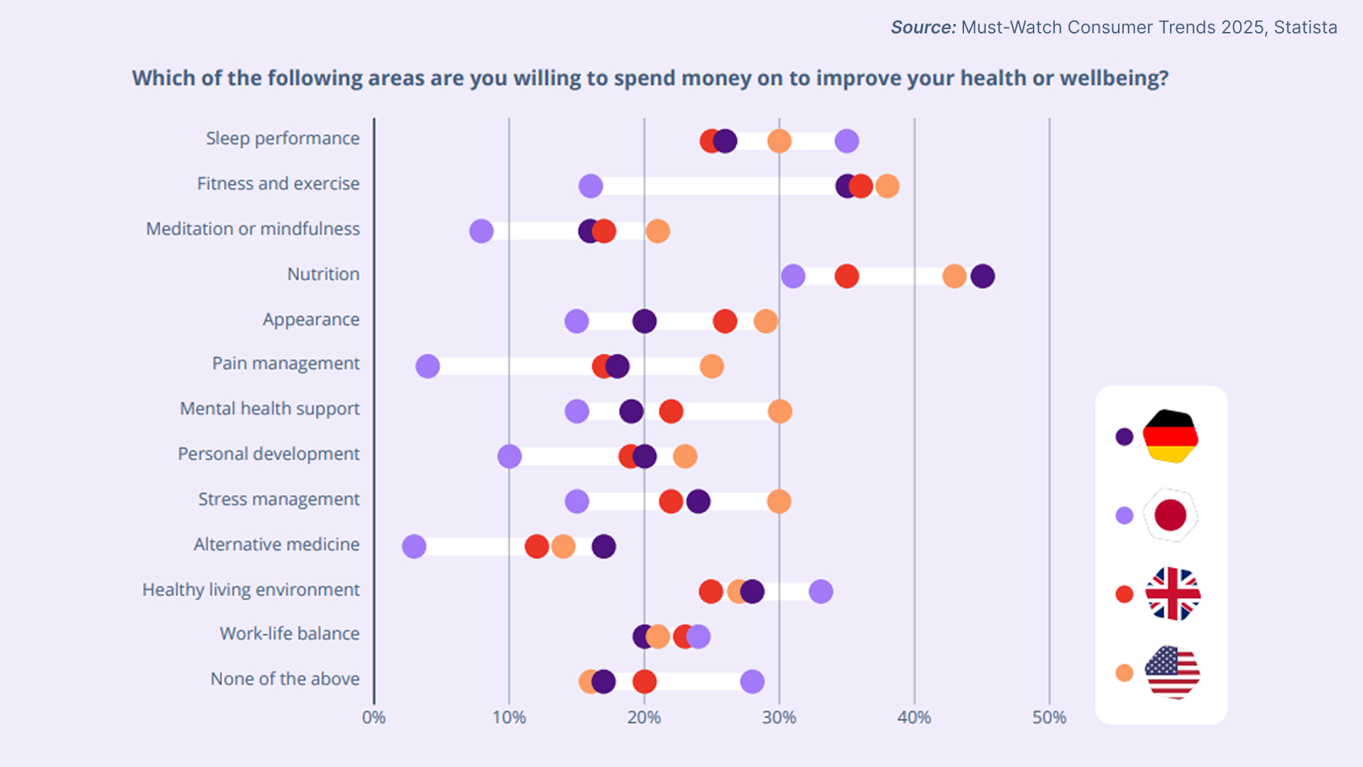 Значительная часть потребителей готова тратить больше на товары, которые способствуют поддержанию здоровья — особенно в категориях питания, моды, красоты и лайфстайла.