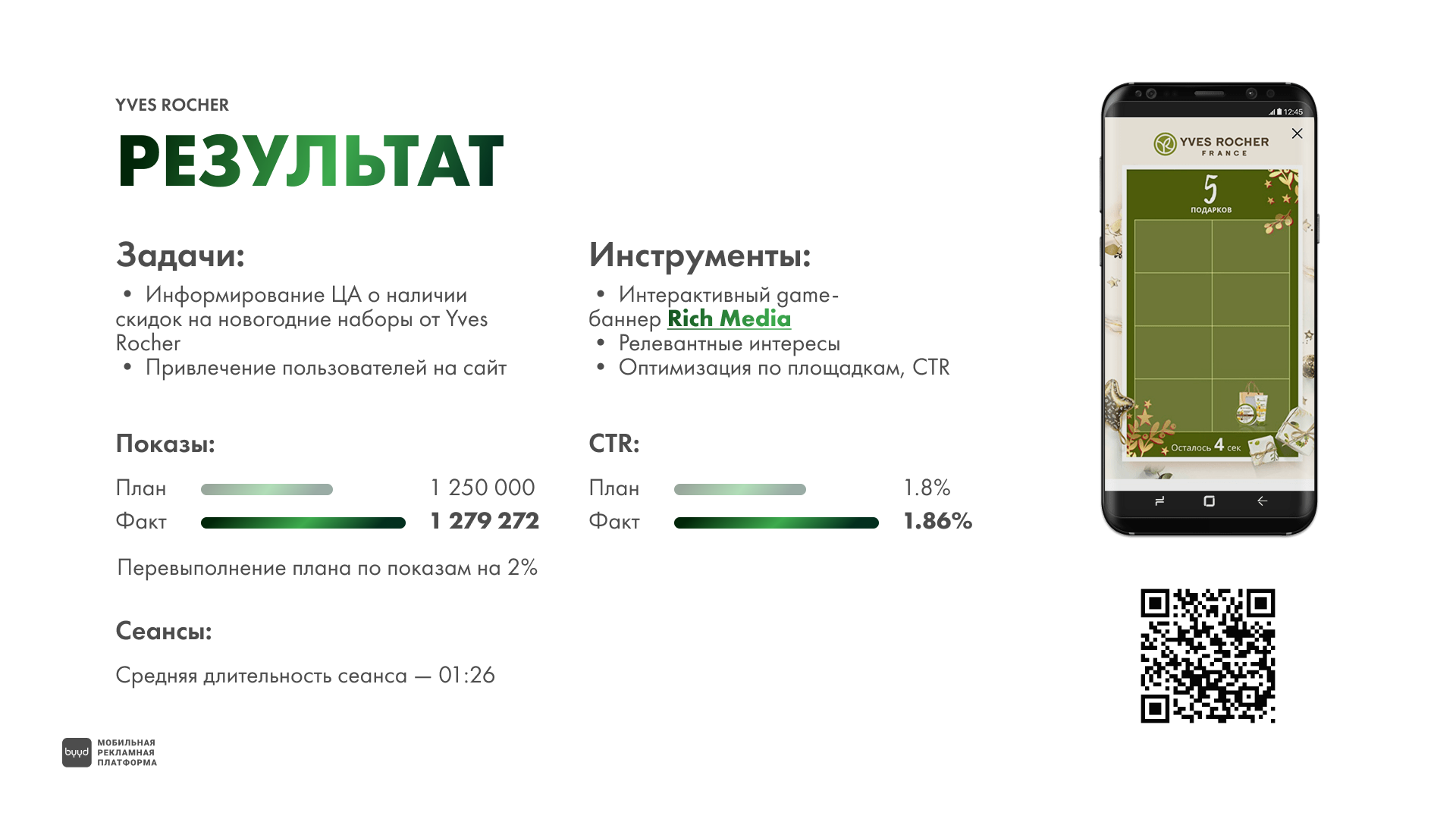 Для информирования аудитории о скидках на новогодние наборы от Yves Rocher был использован интерактивный Rich Media с игровой механикой.