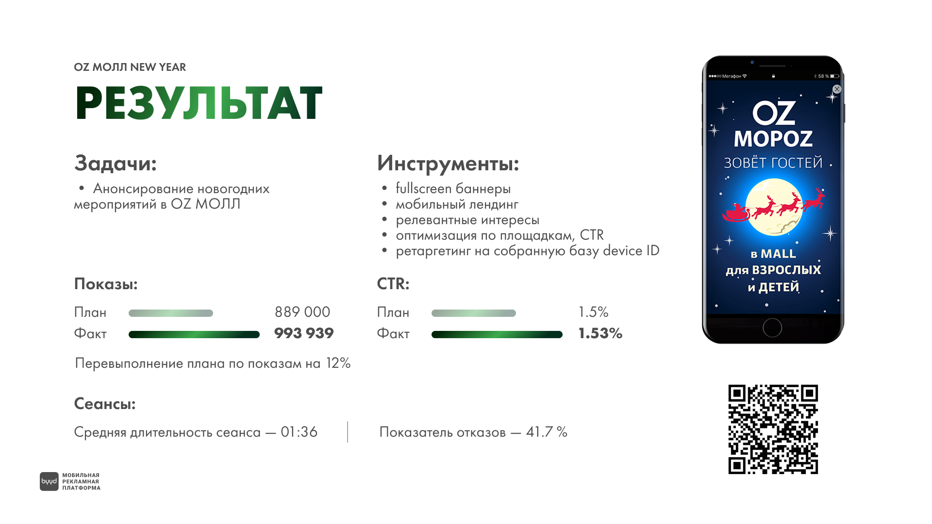 Для анонсирования новогодних мероприятий в ТЦ OZ МОЛЛ в Краснодаре мобайл-специалисты BYYD запустили рекламу на две целевые аудитории: семьи с детьми и любители активного шопинга.