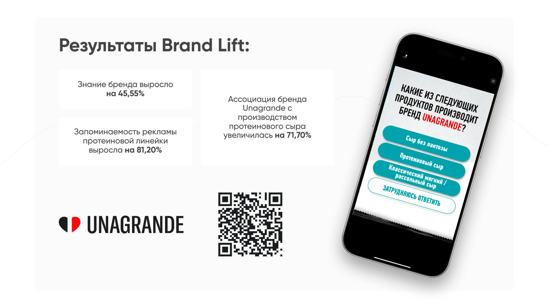 Например, команда BYYD провела Brand Lift исследование в ходе рекламной кампании Unagrande. Удалось выяснить, что благодаря мобильному продвижению знание бренда выросло на 45,55%, а запоминаемость рекламы протеиновой линейки — на 81,20%.